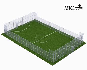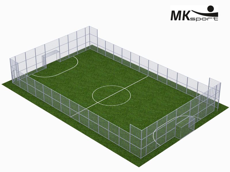 Ограждение для спортивной площадки позволяет организовать удобное и безопасное место для командных игр с мячом. Данная модель ограждения оборудована с торцевых сторон футбольными воротами, а также секциями с дверьми. Размер ограждения – 17*28 м. Высота забора по боковой стороне составляет 3 метра, по торцевой 4,5 м. Ограждение изготовлено из профильных труб 80*80*3, 40*20*2 и 20*10*1,5 мм. Стандартный цвет изделия серый.