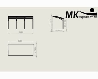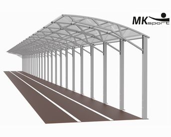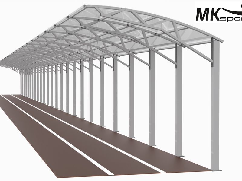 Данная модель навеса является универсальной и может быть использована для благоустройства стадионов и беговых дорожек. Под навесом можно расположить скамейки запасных, небольшие трибуны, места для хранения оборудования. Длина навеса – 6 метров. Основные столбы изготовлены из квадратного профиля 120*120*5 мм. Фермы и направляющие выполнены из профилей 80*40*3 и 40*40*2 мм. Материал крыши – прочный сотовый поликарбонат 8 мм. Стандартный цвет каркаса серый.