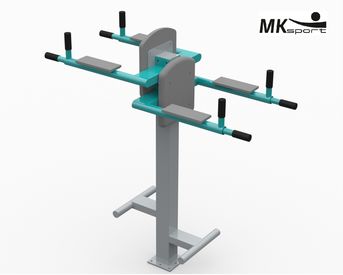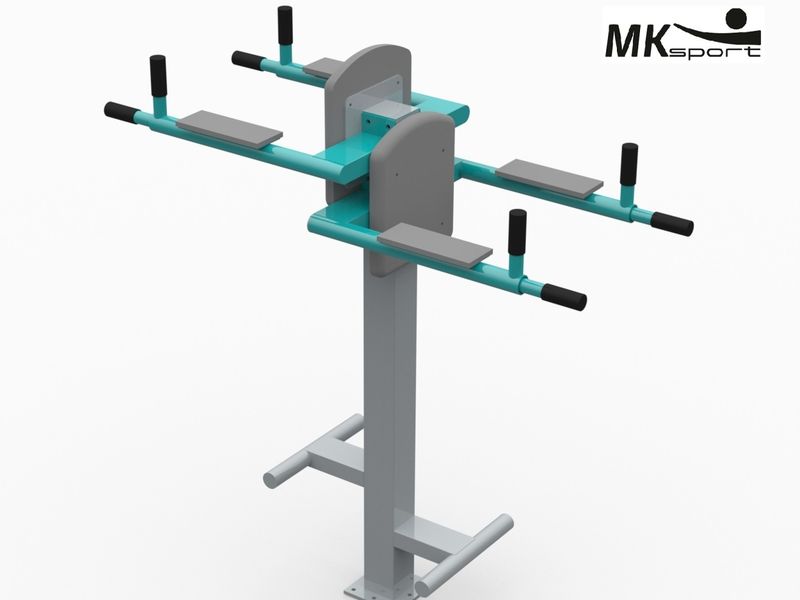 Тренажер предназначен для выполнения двух упражнений: отжиманий на брусьях и тренировки мышц пресса. Одновременно оборудование может быть использовано двумя спортсменами для проработки мышцы рук, спины и живота. Тренажер выполнен из стальных профилей 100*100*4, 100*50*3 и 48*3. Для минимизации нагрузки на поясницу имеется пластиковая спинка, фиксирующая корпус во время тренировки. Ручки изготовлены из резины. Стандартное сочетание цветов – серый и бирюзовый.