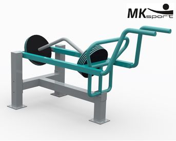Уличный тренажер предназначен для выполнения стандартных приседаний с нагрузкой и укрепления мышц ног и ягодиц. Утяжеление осуществляется за счет металлических дисков, весом по 10 кг каждый. В зависимости от физической подготовки спортсмен может менять уровень нагрузки путем перемещения дисков по направляющей. Для удобства выполнения упражнения плечевые упоры имеют форму валика. Каркас тренажера выполнен из стальных профилей 100*100*4, 60*60*3, 48*3 и 42*3. Стандартное сочетание цветов – серый и бирюзовый.